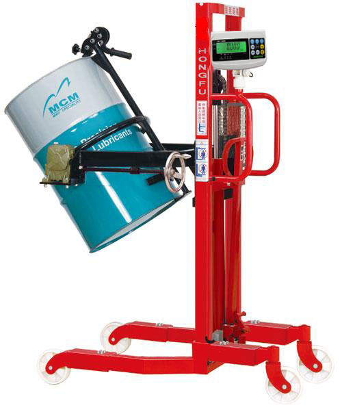 由倒桶車及2只高精度稱重傳感器和高分辨率交直流兩用稱重顯示儀表等組成。倒桶車采用槽鋼門架,耐磨尼龍腳輪,結構表面防銹烤漆,可以輕度防止化學原料和水分對結構的腐蝕。油桶被夾抱提升后,可以在空中做大于180度的翻轉或停留等動作,并可將油桶裝卸于汽車、堆垛。手動液壓油桶搬運車設計新穎,結構緊湊,輕巧靈活。主要適用于工廠車間,倉庫,油庫的油桶裝卸、搬運、堆垛等。特別適用于化工,食品車間倒料或配料使用。